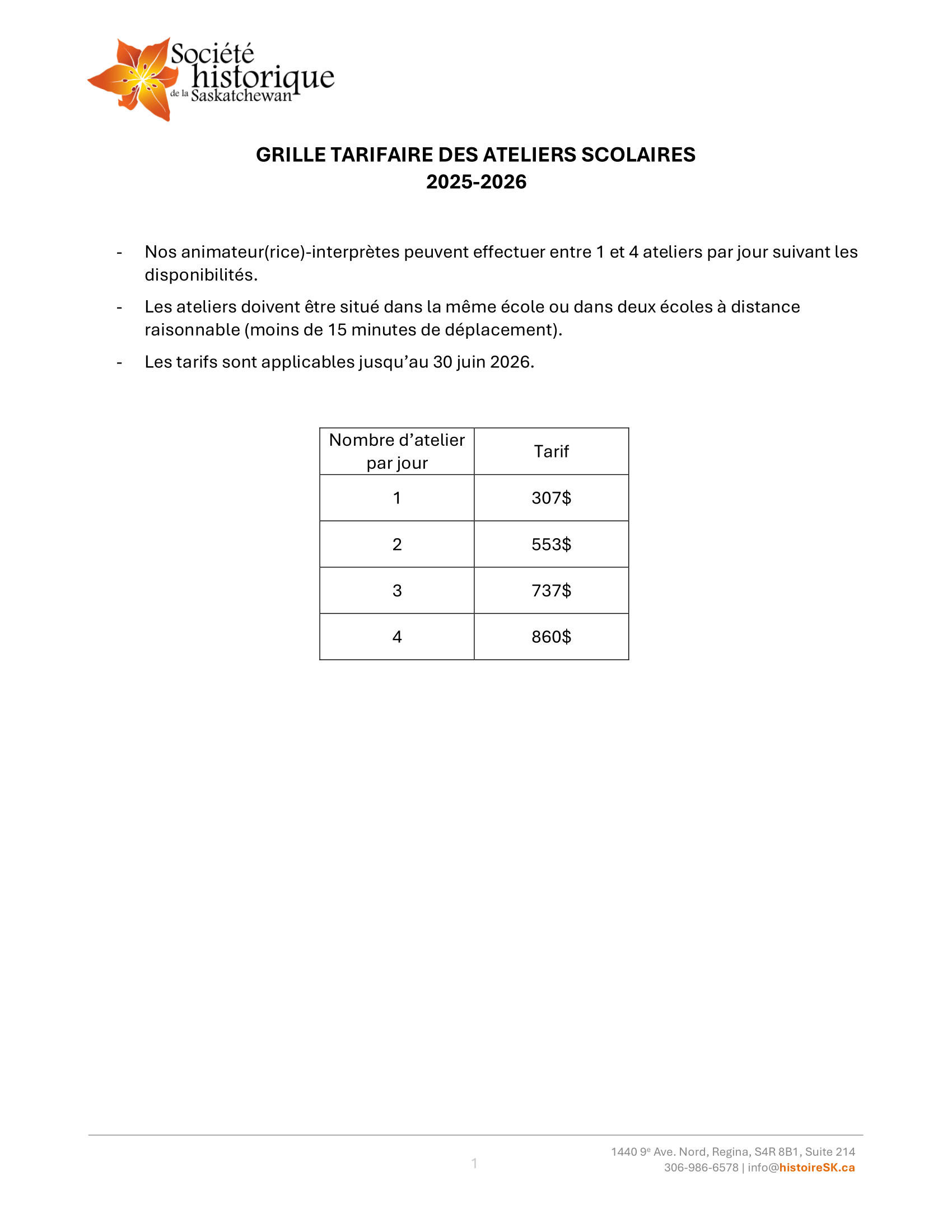 Avant de réserver un atelier scolaire, il est recommandé de consulter le calendrier des disponibilités (ci-dessous) et la charte tarifaire. Pour des renseignements complémentaires, veuillez contacter scolaire@histoireSK.ca.